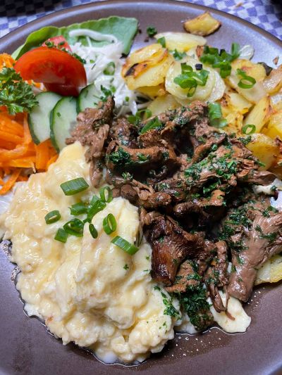 Rührei mit Pfifferlingen und Bratkartoffeln