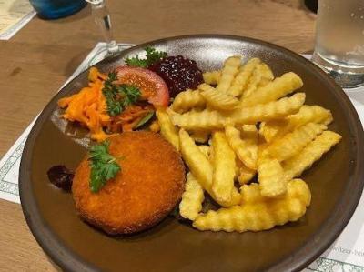 Gebackener Camembert mit Preiselbeeren und Pomfrits